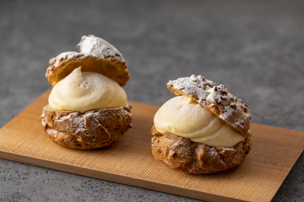 - シュー生地が焼けたら粗熱を取り、上部を斜めに切り取る。中にカスタードを絞り入れ、カットしたいちじくを飾り、粉糖をかけたら完成!