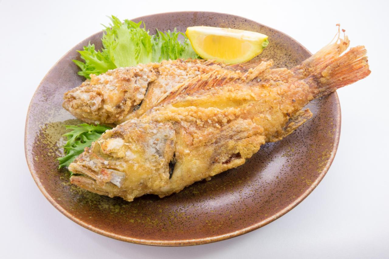 - 下味をつけたオニカサゴに片栗粉をまぶし、180℃の油でカラッと揚げる。