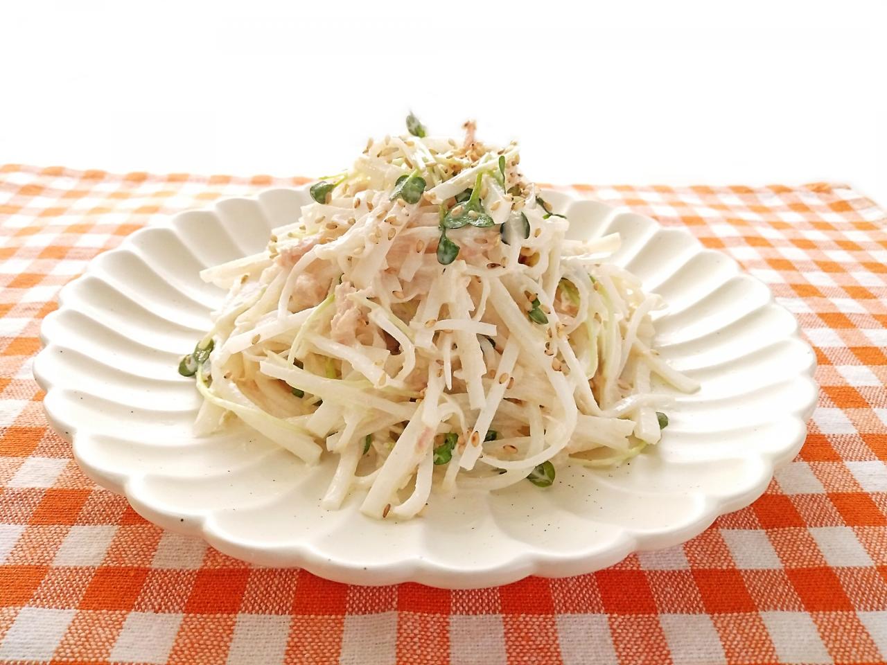 - 大根は皮をむき、5〜6mm厚さのいちょう形に切る。ツナは缶汁をきる。