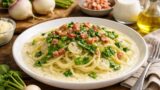 旬のかぶを丸ごとポタージュ状にしてソースに使う、心まで温まる一皿です。かぶ特有の優しい甘みと、牛乳・バターのコクが太めのパスタにしっかりと絡みます。カリッと炒めたベーコンの塩気とかぶの葉の彩りがアクセントになり、まるでレストランのような本格的な味わいを楽しめます。