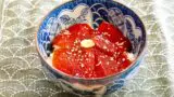 - 炒め調味料の砂糖、酒、酢、しょうゆ、花椒粉を混ぜ、ごま油を合わせる。