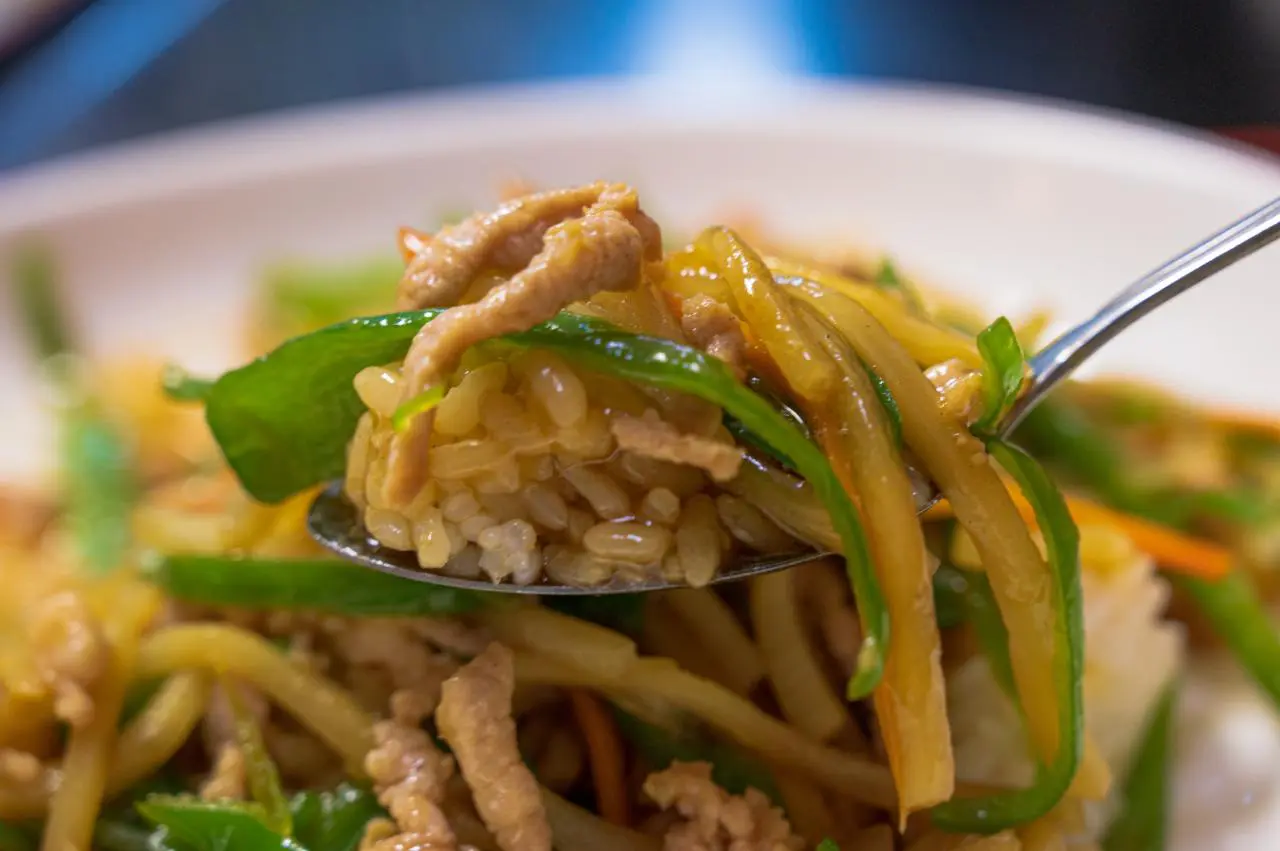 - ご飯の上に紅生姜を敷き、炒めた具材をのせて完成!