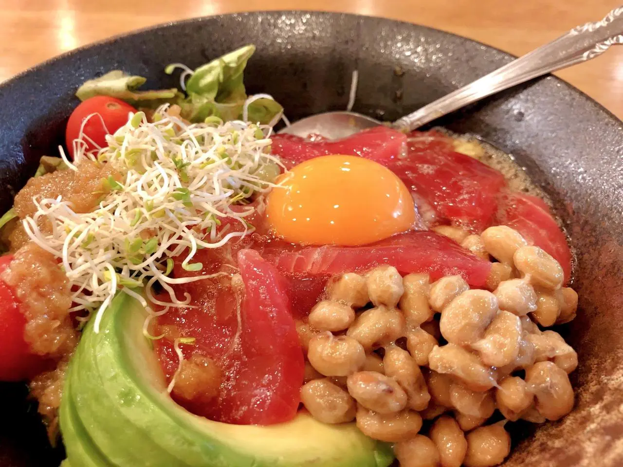- 丼に(2)を盛り付け、マグロのたたき、納豆、スライスしたアボカドをバランスよく盛り付ける。