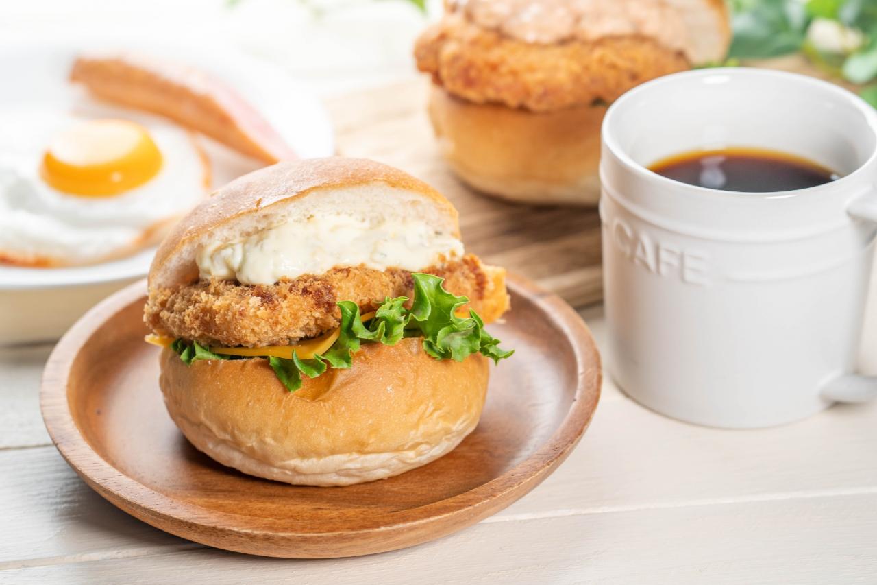 3. パンはオーブントースターかフライパンで軽く焼き色がつくまで焼き、断面にバター(適量)を塗る。たら1切れ、サラダ菜・ブロッコリースプラウト・四川風タルタルソース(各適量)をパン1コ分で挟む。残りも同様にしたら完成!