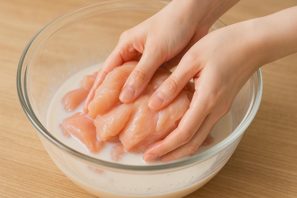 - 牛乳の乳タンパクが鶏むね肉の繊維をやわらかくすることで、短時間でもジューシーに!