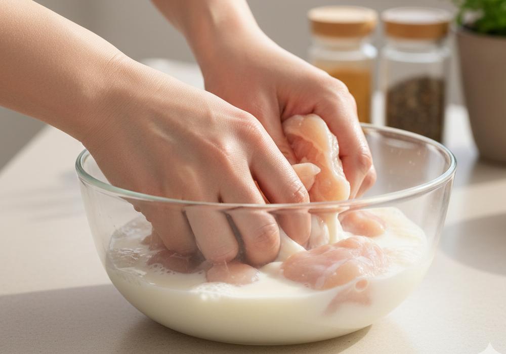 - 30分おくと、牛乳がスッと肉に染み込み、肉がしっとりジューシーに仕上がる。