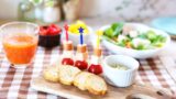 トースターでまるごと焼いて旨みを閉じ込めたエリンギと、香ばしくソテーしたズッキーニ・ベーコンを串に刺した、見た目も華やかなピンチョスです。スパイシーなカレーマヨソースがアクセントになり、おもてなしやおつまみにぴったりの一品です。