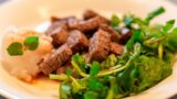 一口サイズにカットした牛ステーキ肉を香ばしく焼き、大根と玉ねぎをベースにした特製おろしソースでいただく、さっぱりとしたステーキ料理です。牛肉に下味をしっかりともみ込み、焼きすぎないことで、ジューシーな食感が楽しめます。にんにくと玉ねぎの風味が肉の旨みを引き立てる万能ソースは、ご飯にもお酒にも合う一品です。