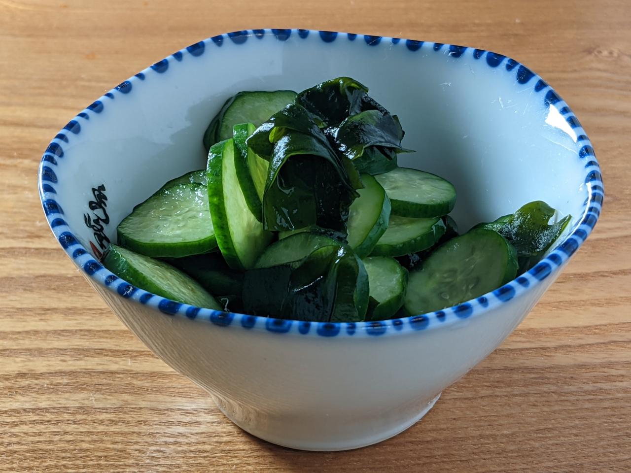 - しめじは石づきを落として小房に分ける。きゅうりは縦半分に切って種をこそぎ取り、斜め1cm厚さに切る。わかめはざく切りにする。