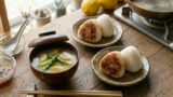 蒸し豚の蒸し汁を活用したお味噌汁と、2種類のおにぎりです。豚肉とキャベツの旨みが溶け出した蒸し汁にかつお節の香りを重ねることで、料亭のような深みのある味噌汁に仕上がります。さらに、特製黒酢だれで伸ばしたおにぎり用のみそは、香ばしさと酸味が食欲をそそる驚きの美味しさです。
